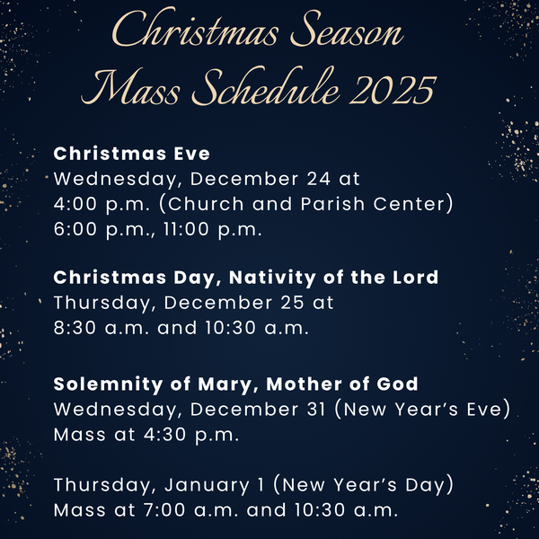 This holy day of obligation takes place on Monday, Dec. 8. It is a great opportunity to honor our Blessed Mother. Mass times are 8:30 a.m., 12:00 p.m. and 7:00 p.m.